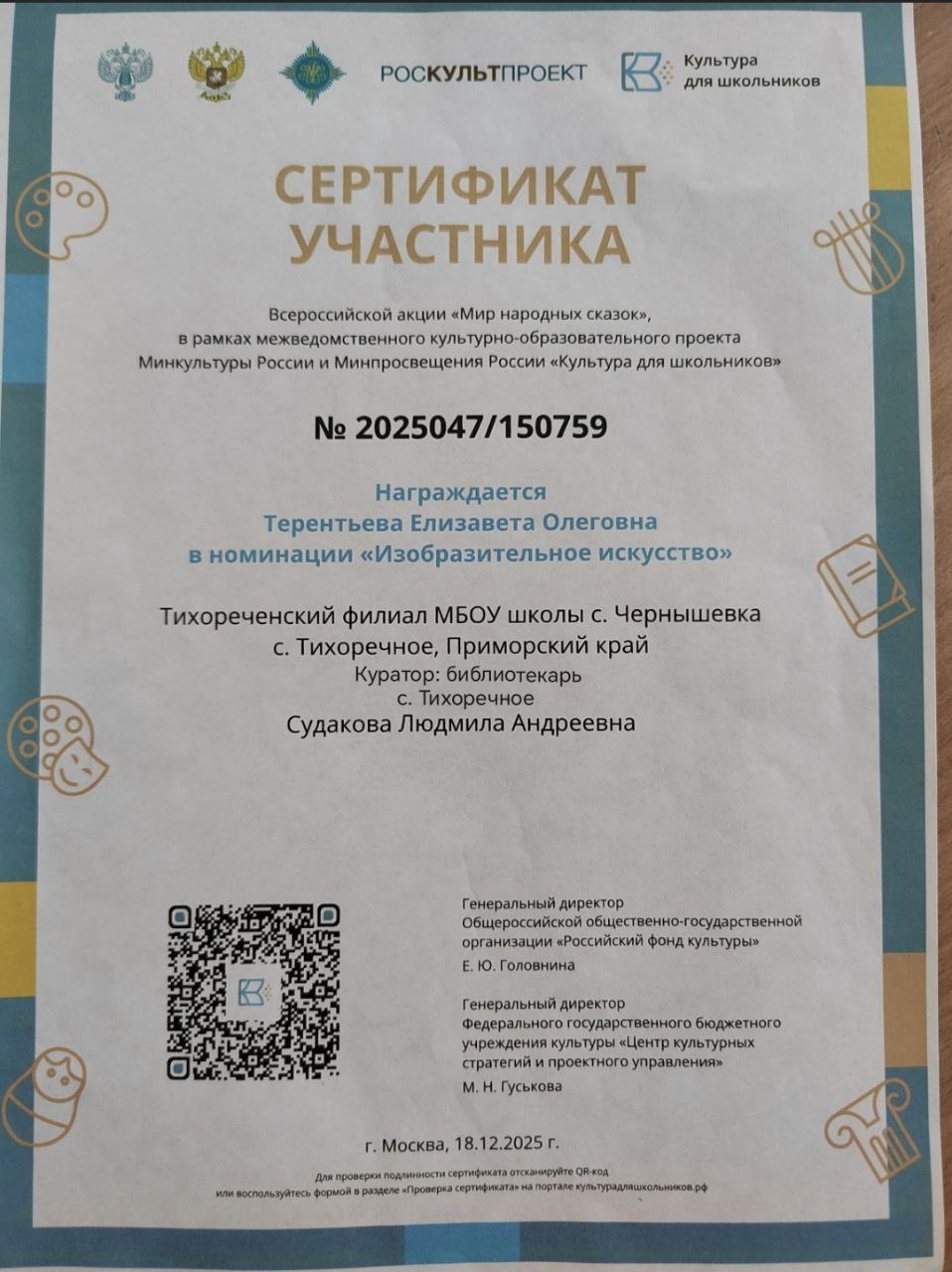 Библиотекарь с. Тихоречное организовала участие активистки молодёжного движения «Движение первых» Терентьевой Елизавете во Всероссийской акции «Мир народных сказок», в рамках межведомственного культурно-образовательного проекта Минкультуры России «Культура для школьников».